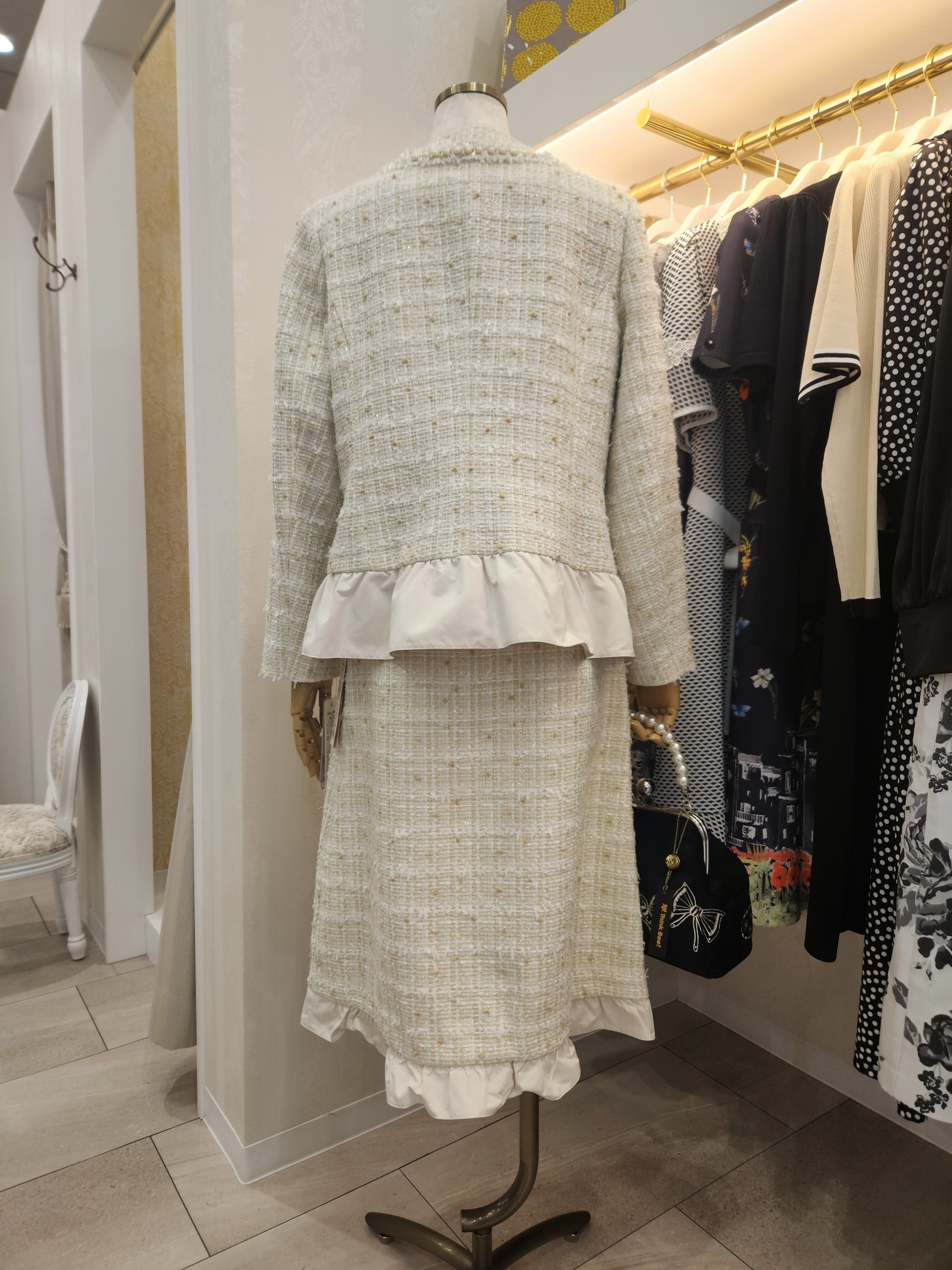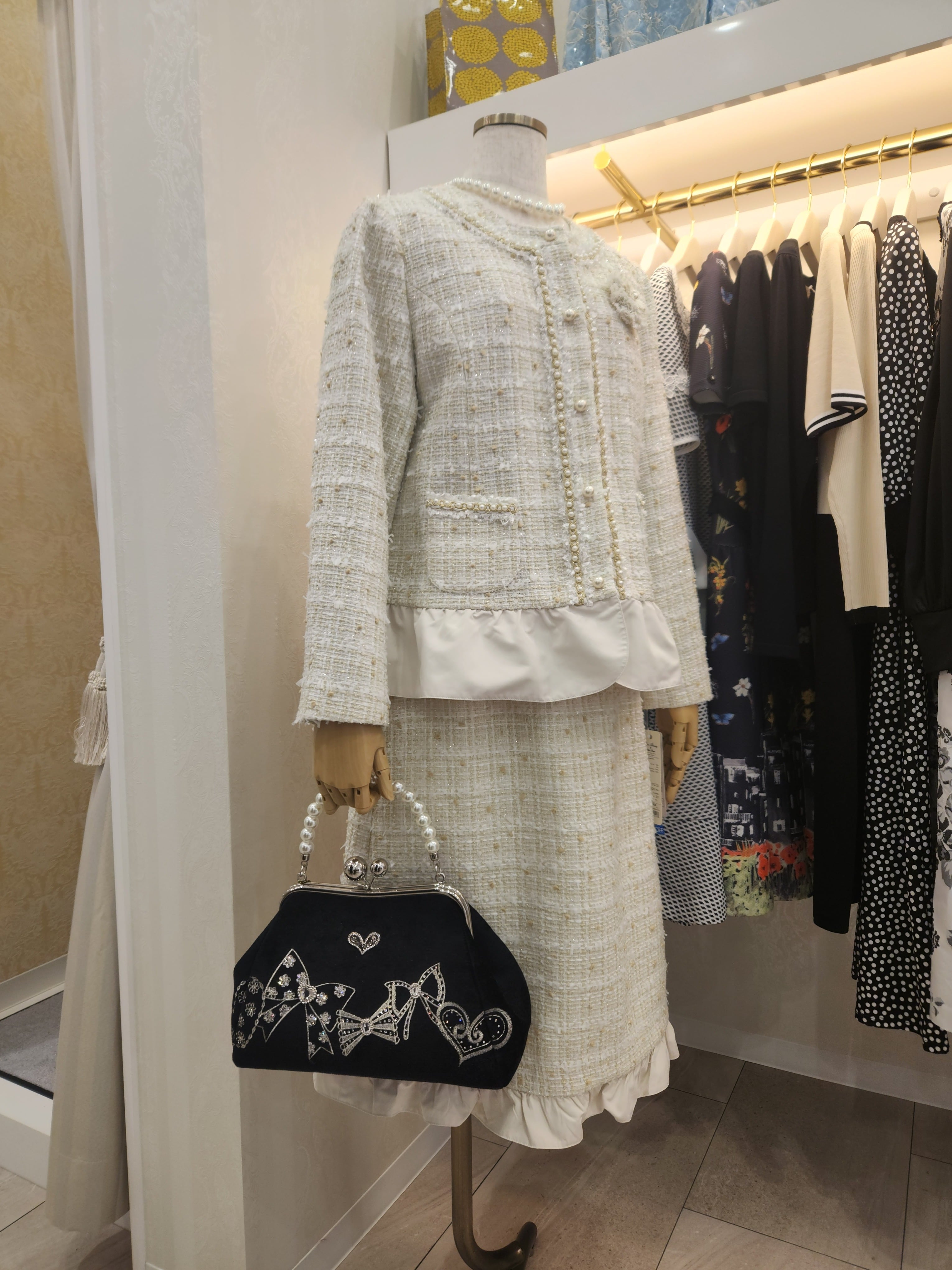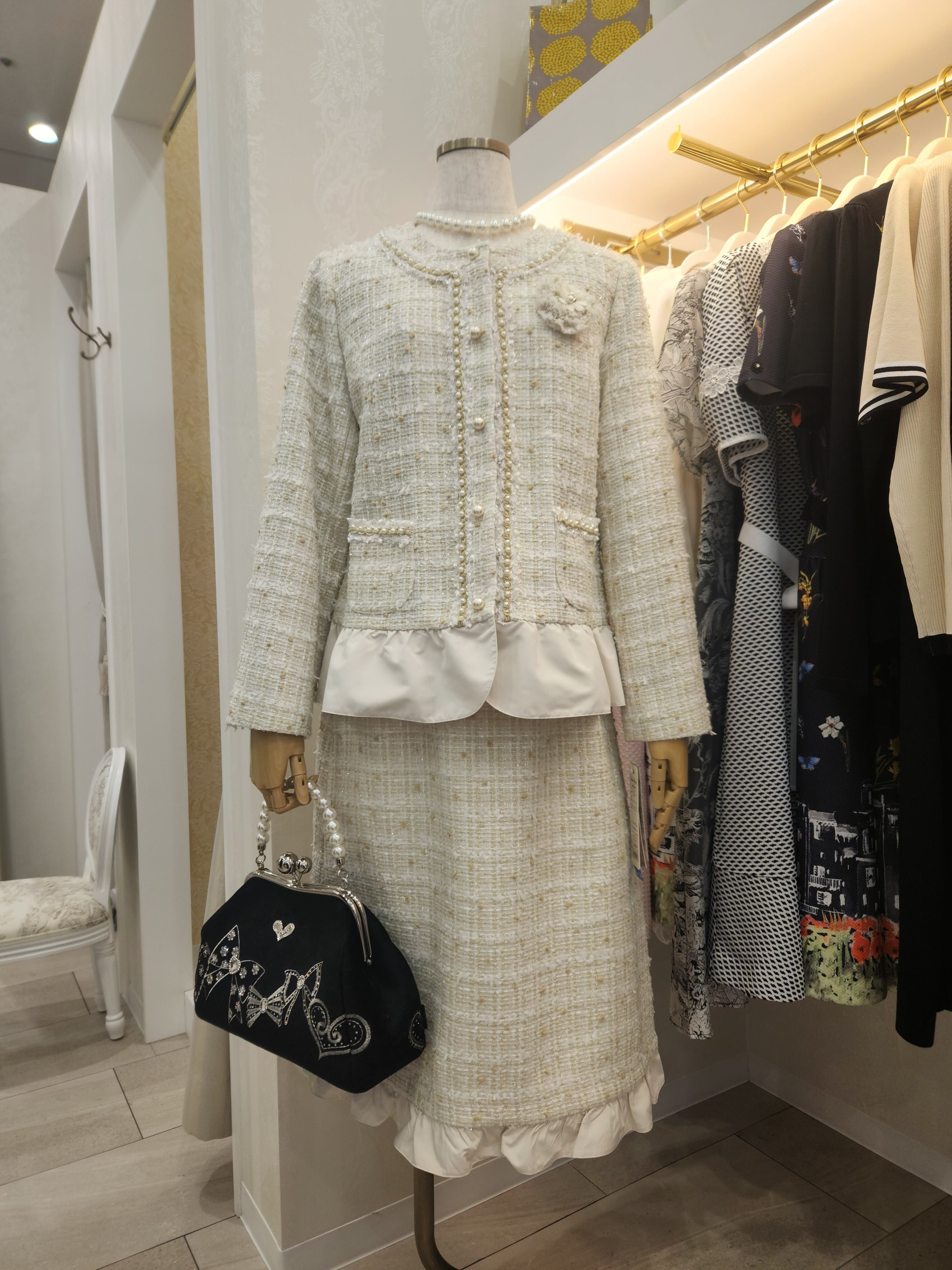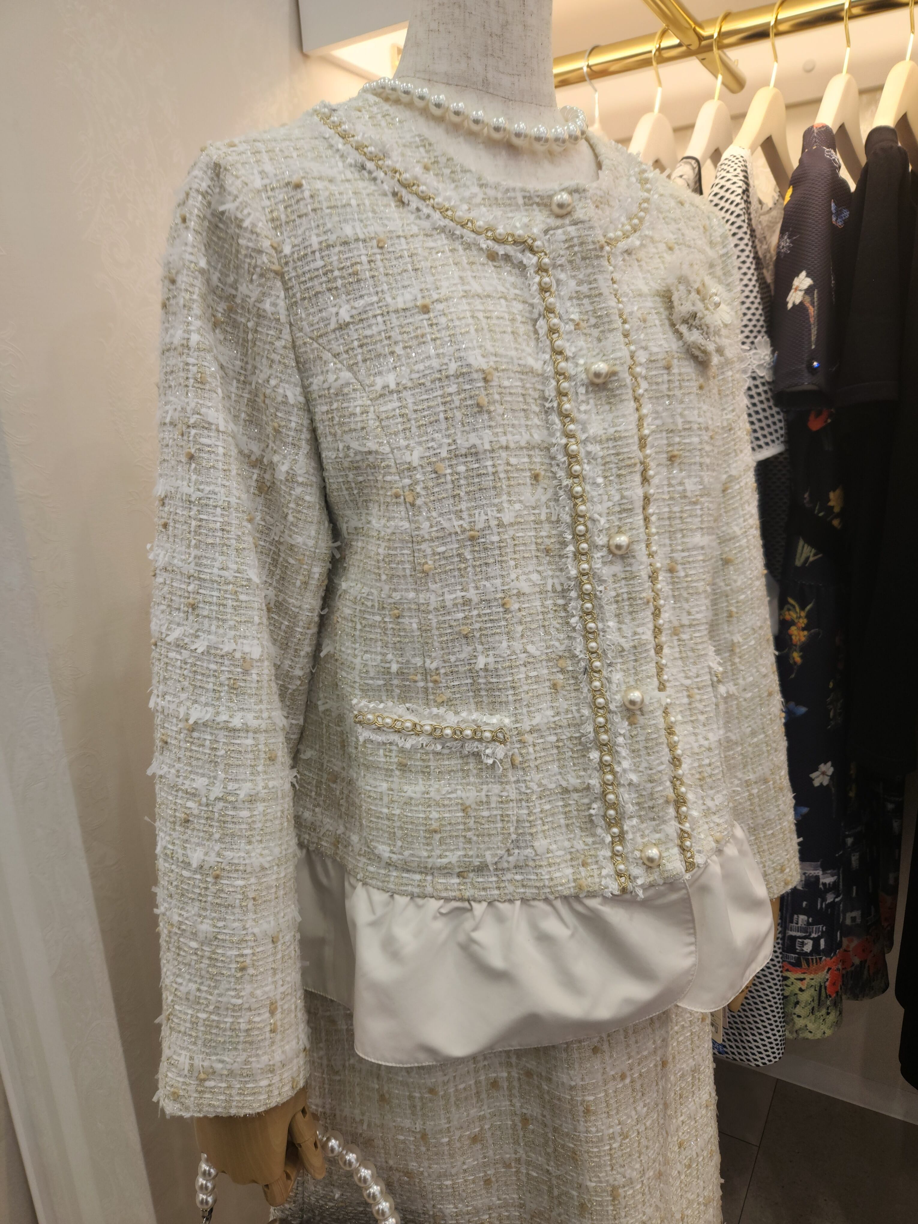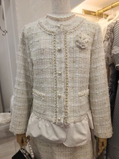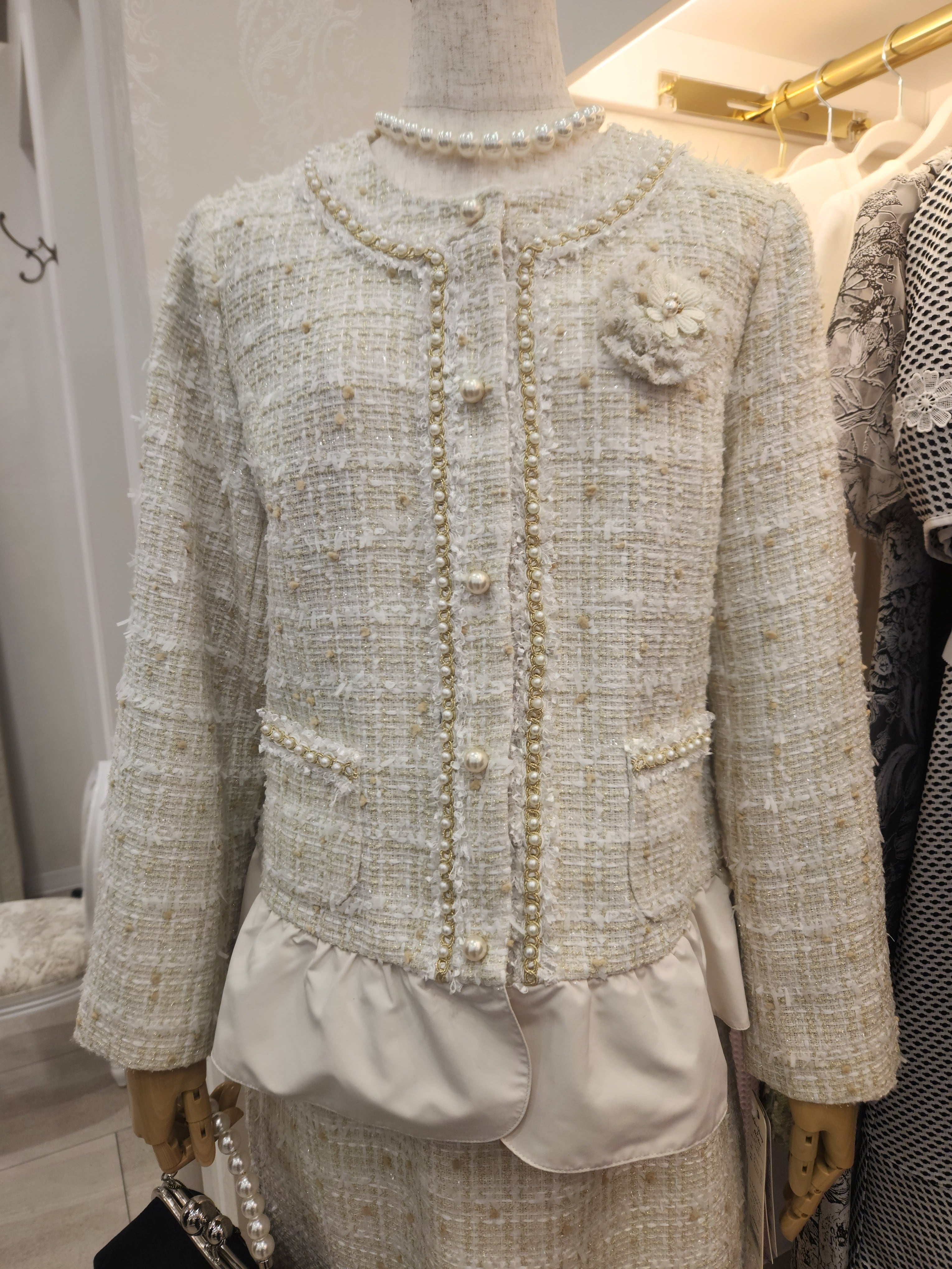 パールとフリル装飾が女性らしい上品ラメ入りツィードジャケット(コサージュ付)が登場!