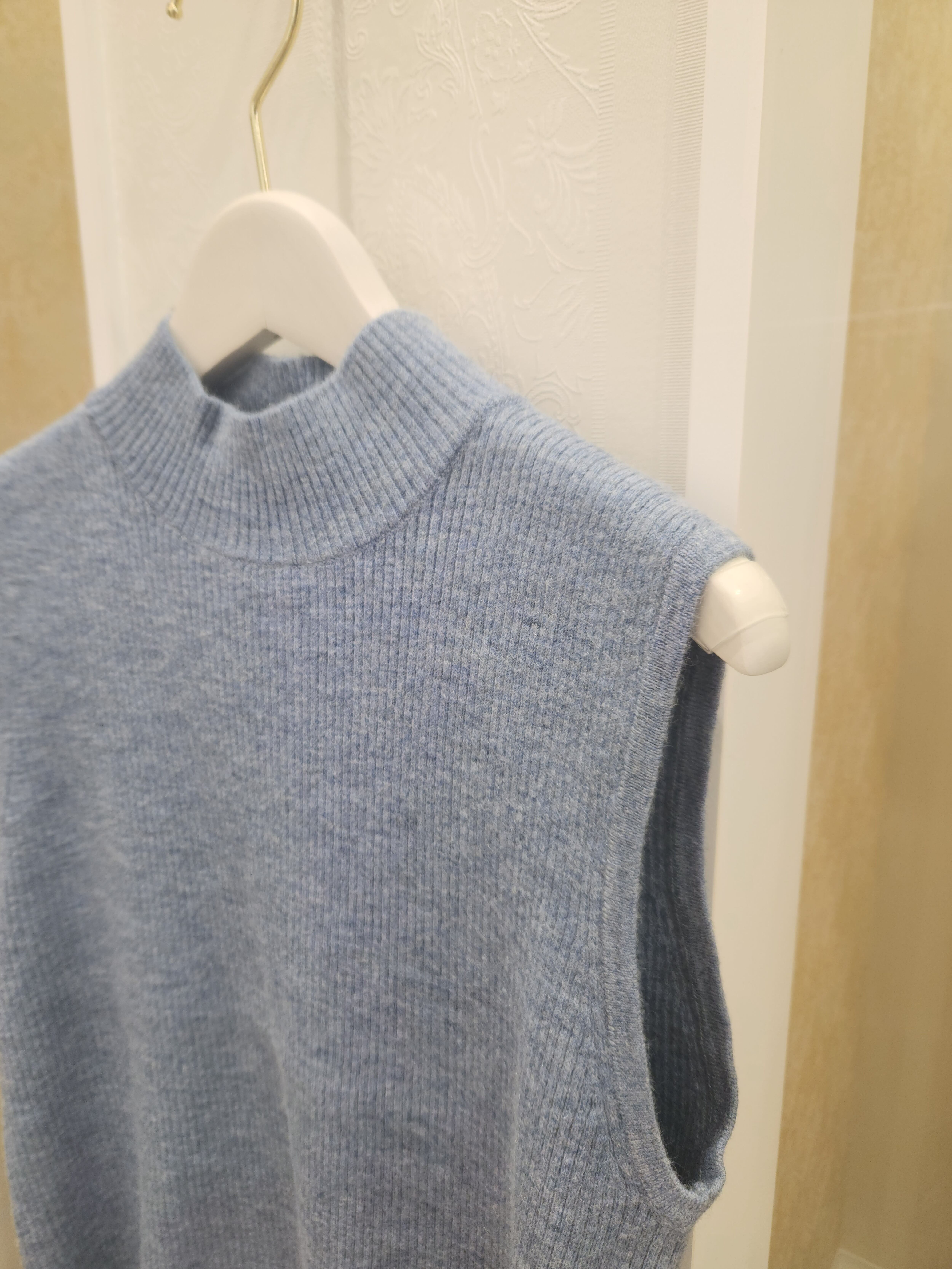 この美しいブルーのボレロとノースリーブのタートルネックは、シンプルながらも洗練されたデザインが魅力。ボレロは軽やかな着心地で、どんなコーディネートにも合わせやすく、ノースリーブのタートルネックは首元をすっきりと見せ、女性らしいシルエットを演出します。