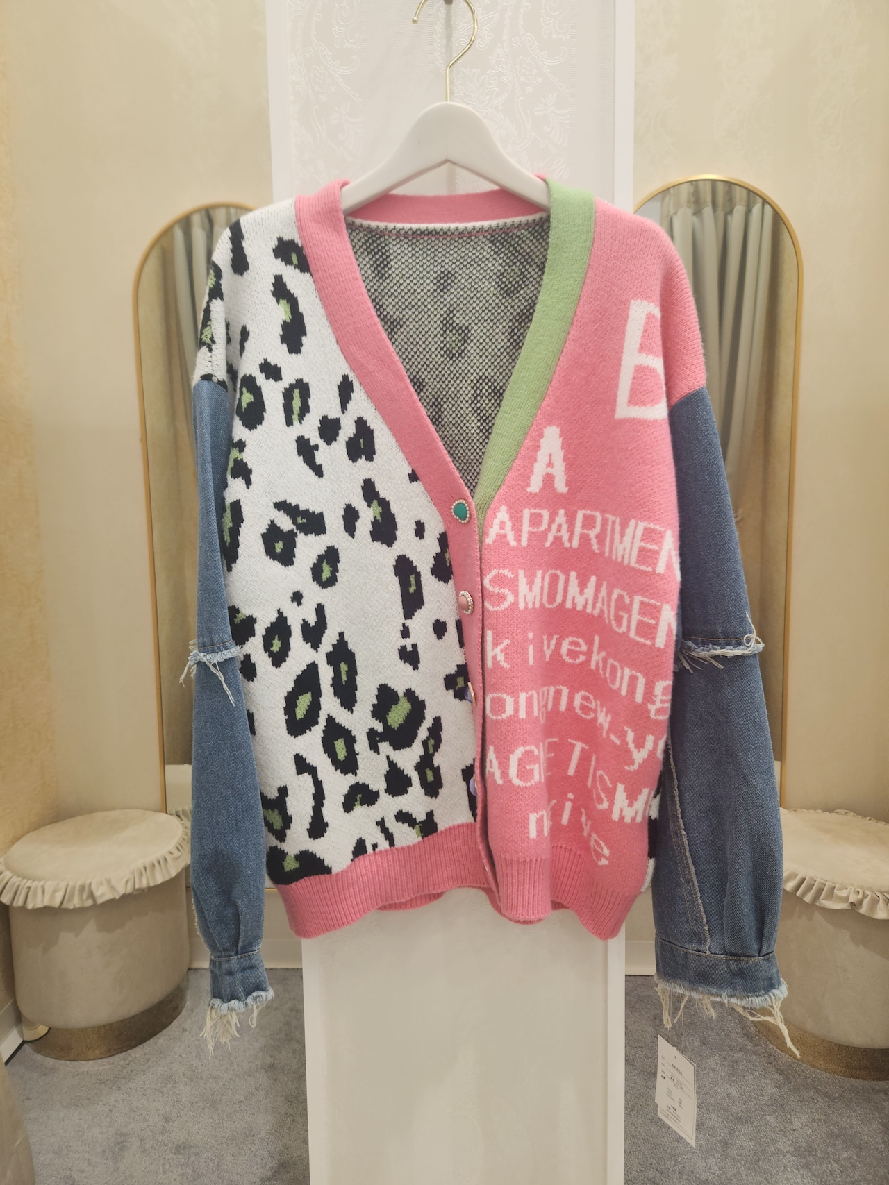 色んな形のボタンとレオパード、英字のアシンメトリー柄が印象的なカーディガン