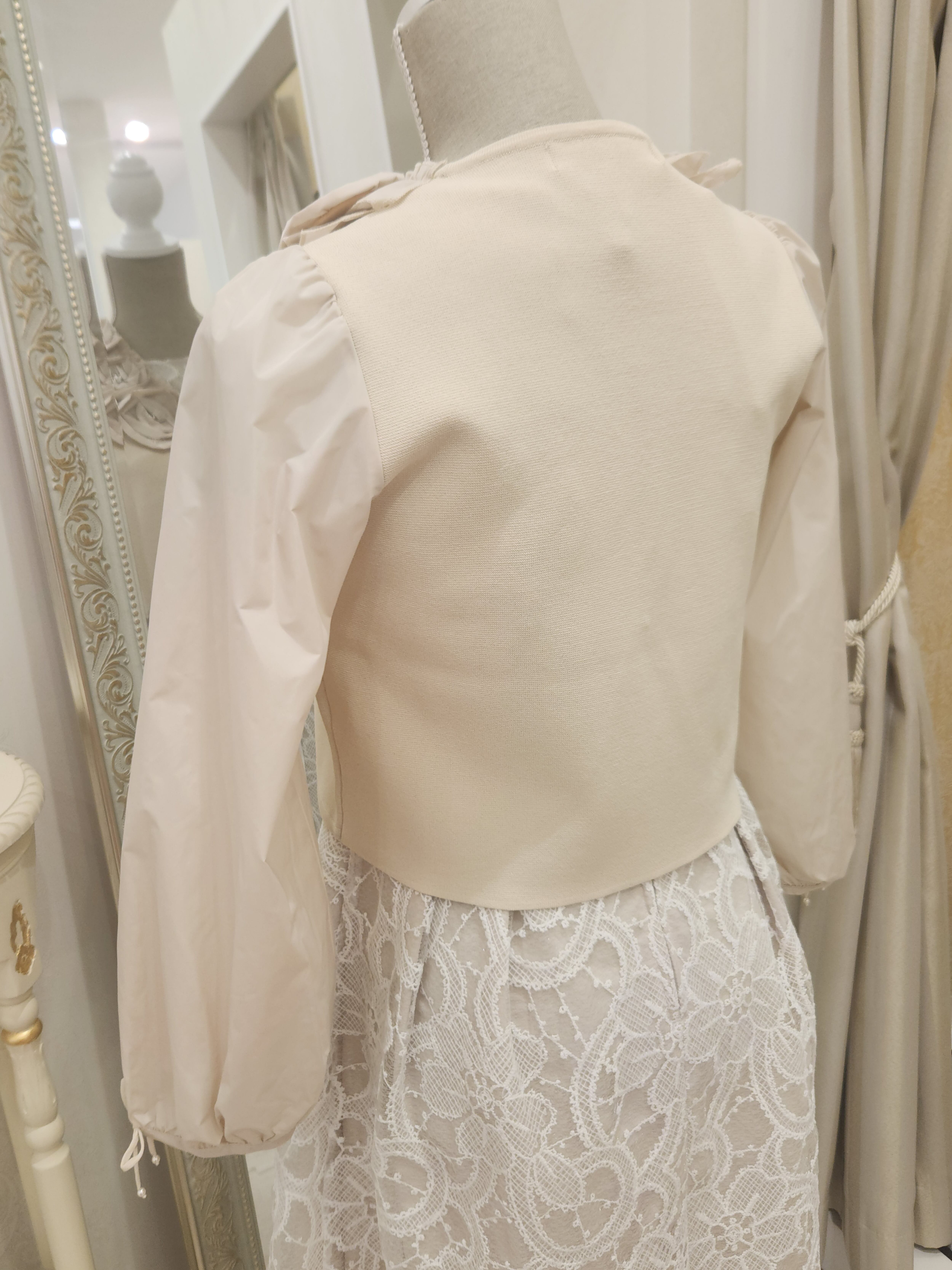 春夏には軽やかなワンピースやブラウスの上から羽織ることで、さらなる華やかさを演出します。また、秋冬には長袖のニットやシャツと重ねることで、季節感のあるスタイルに仕上がります。お袖がタフタ生地でふっくらしているため、楽な羽織心地を感じていただけるでしょう。スカートやパンツ、どんなボトムスに合わせても、女性らしさとエレガンスを引き立てることができます。