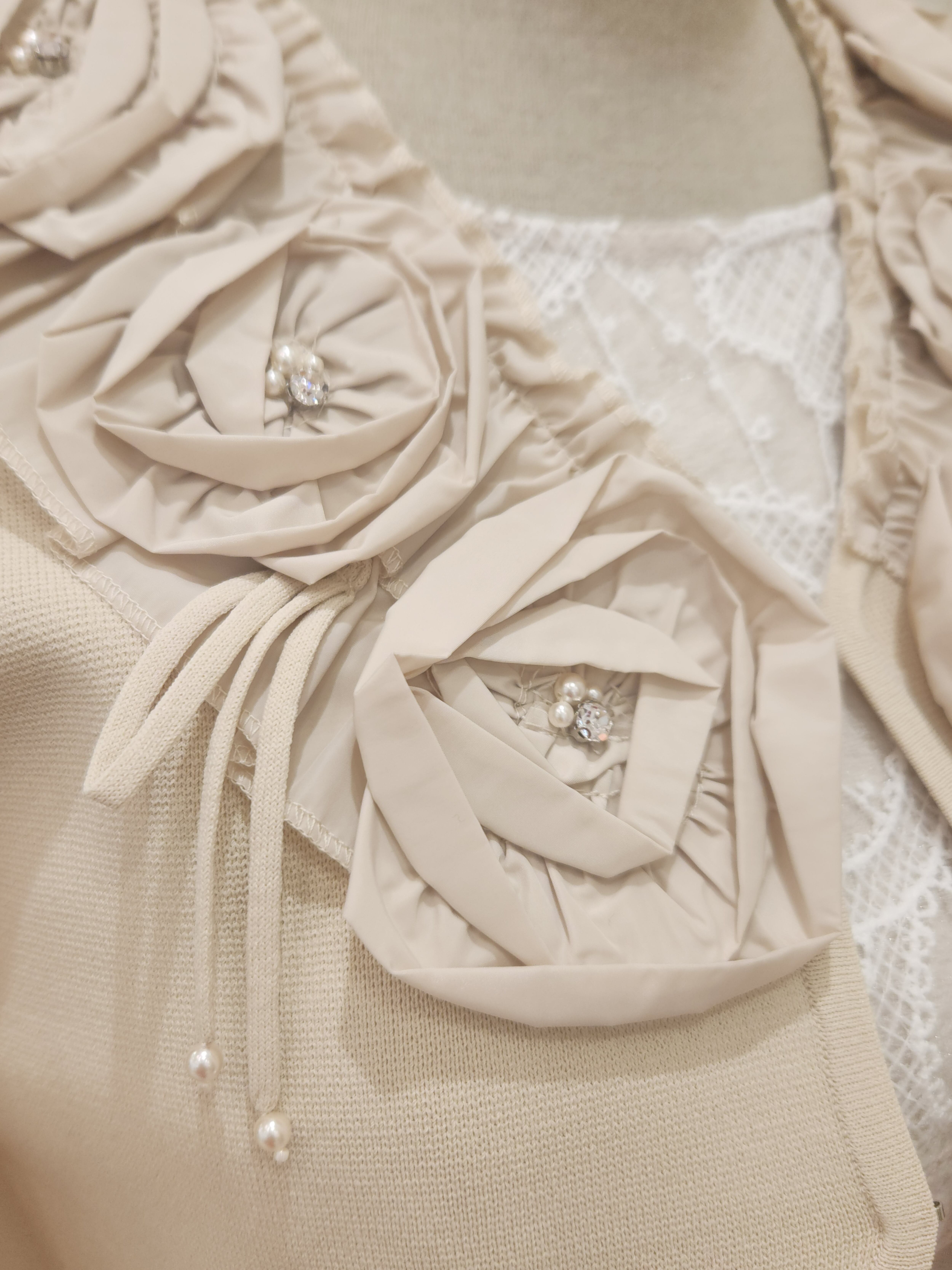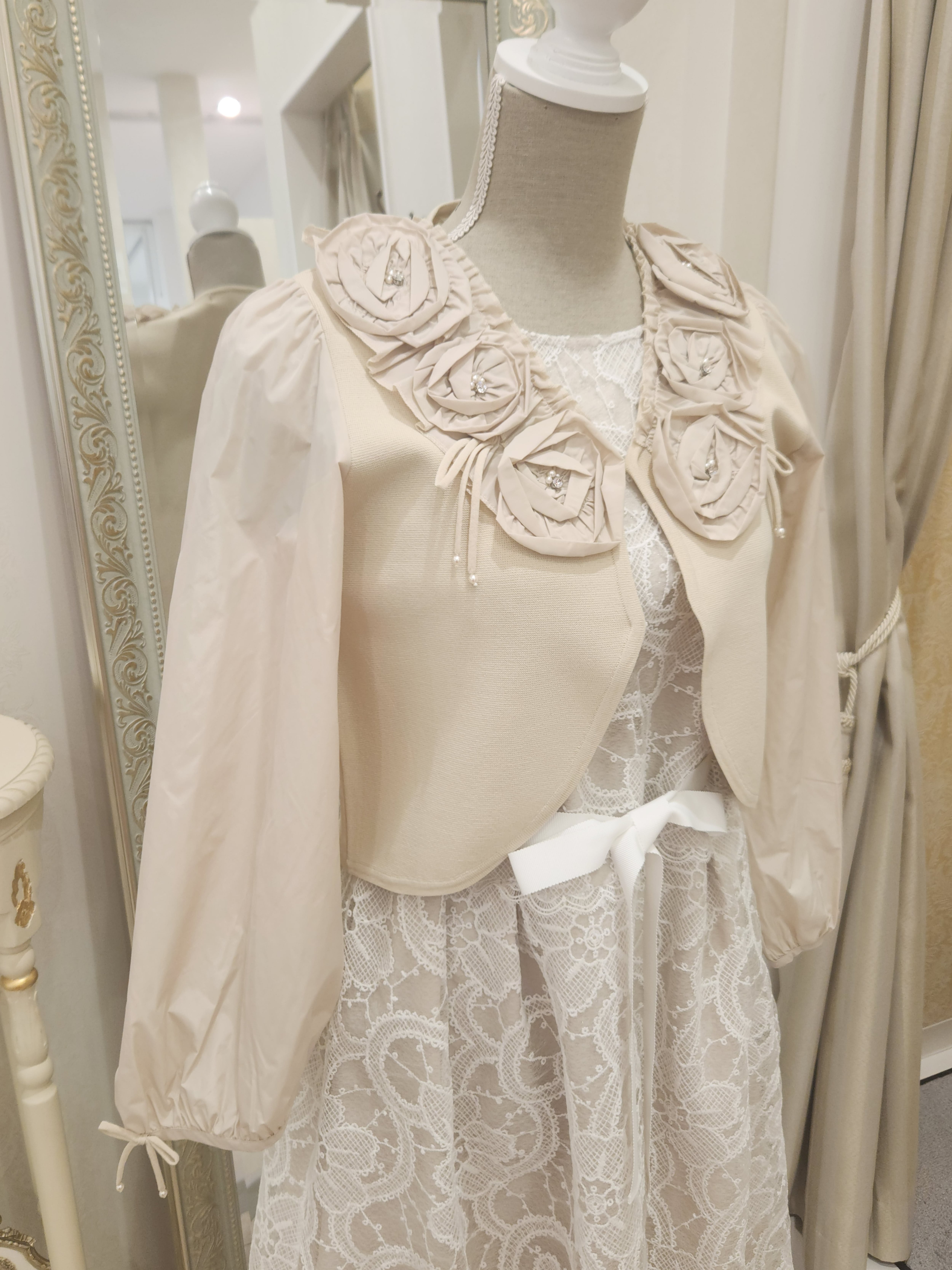 今すぐ着たくなる、自信を与えてくれるこのボレロカーディガンは、立体的なお花モチーフが施された豪華なデザインが特徴です。タフタとニットを組み合わせることで、異素材感のあるスタイルを実現し、特別なシーンや日常のコーディネートにもフィットします。