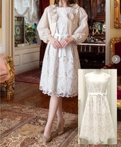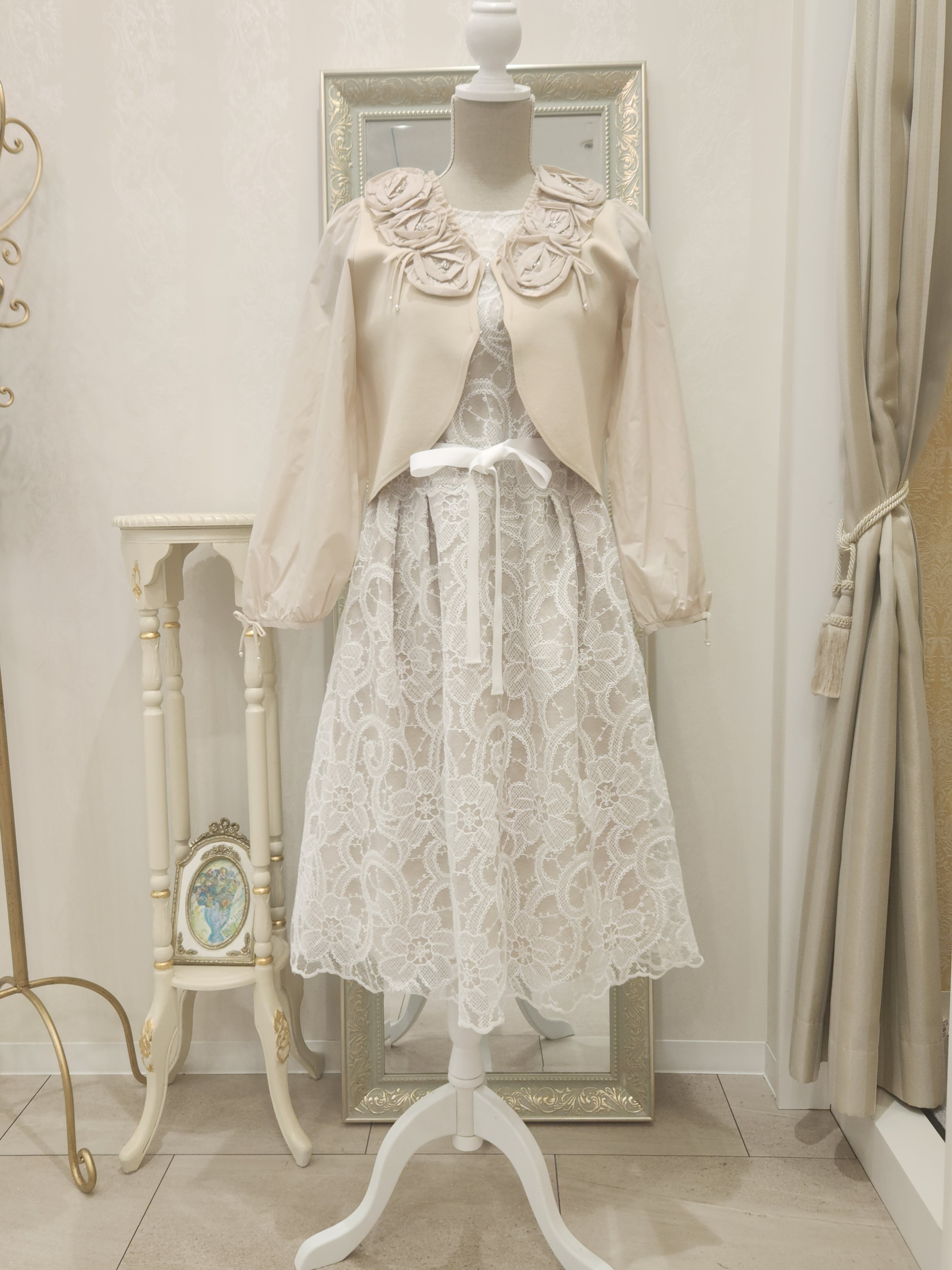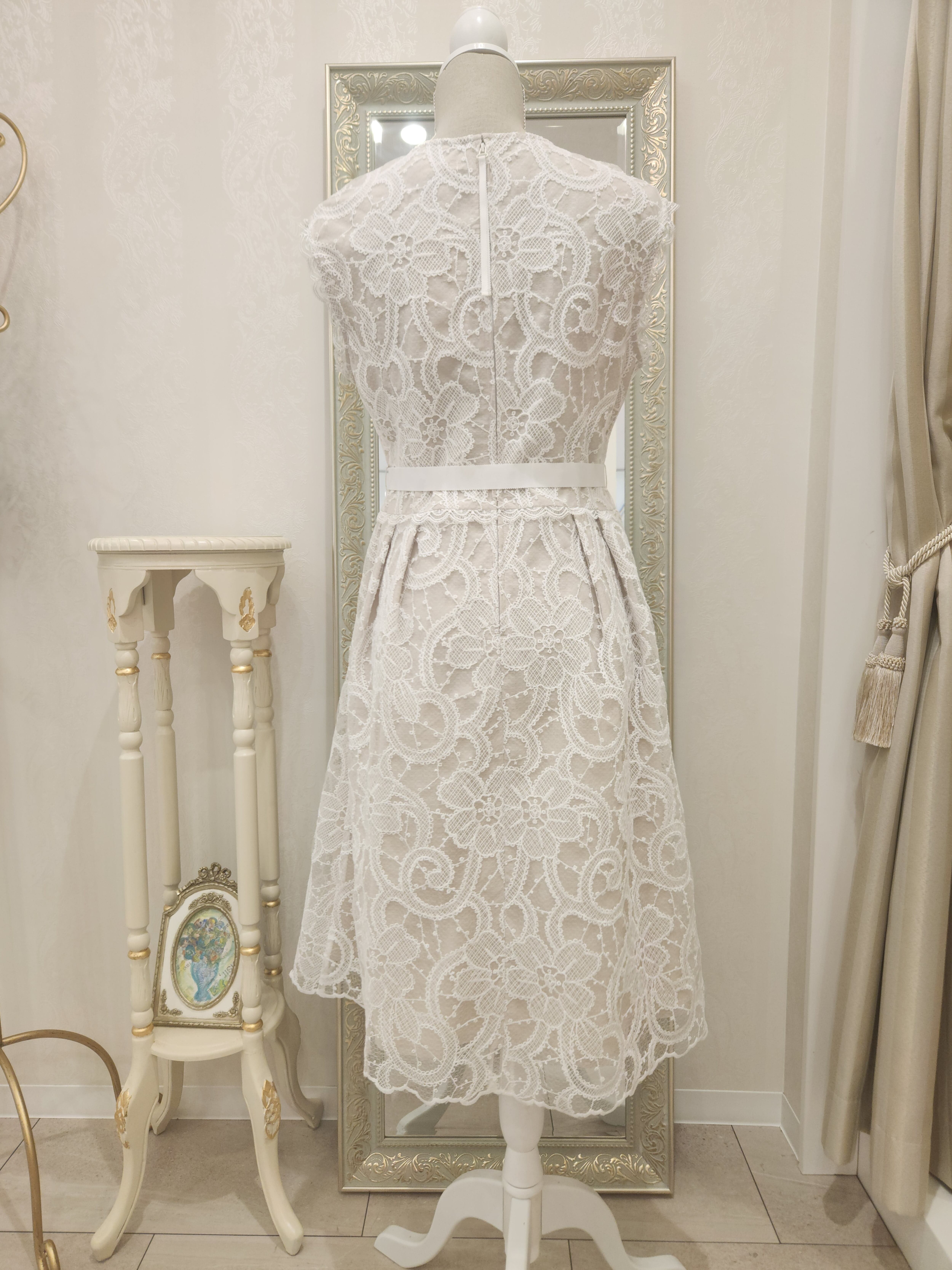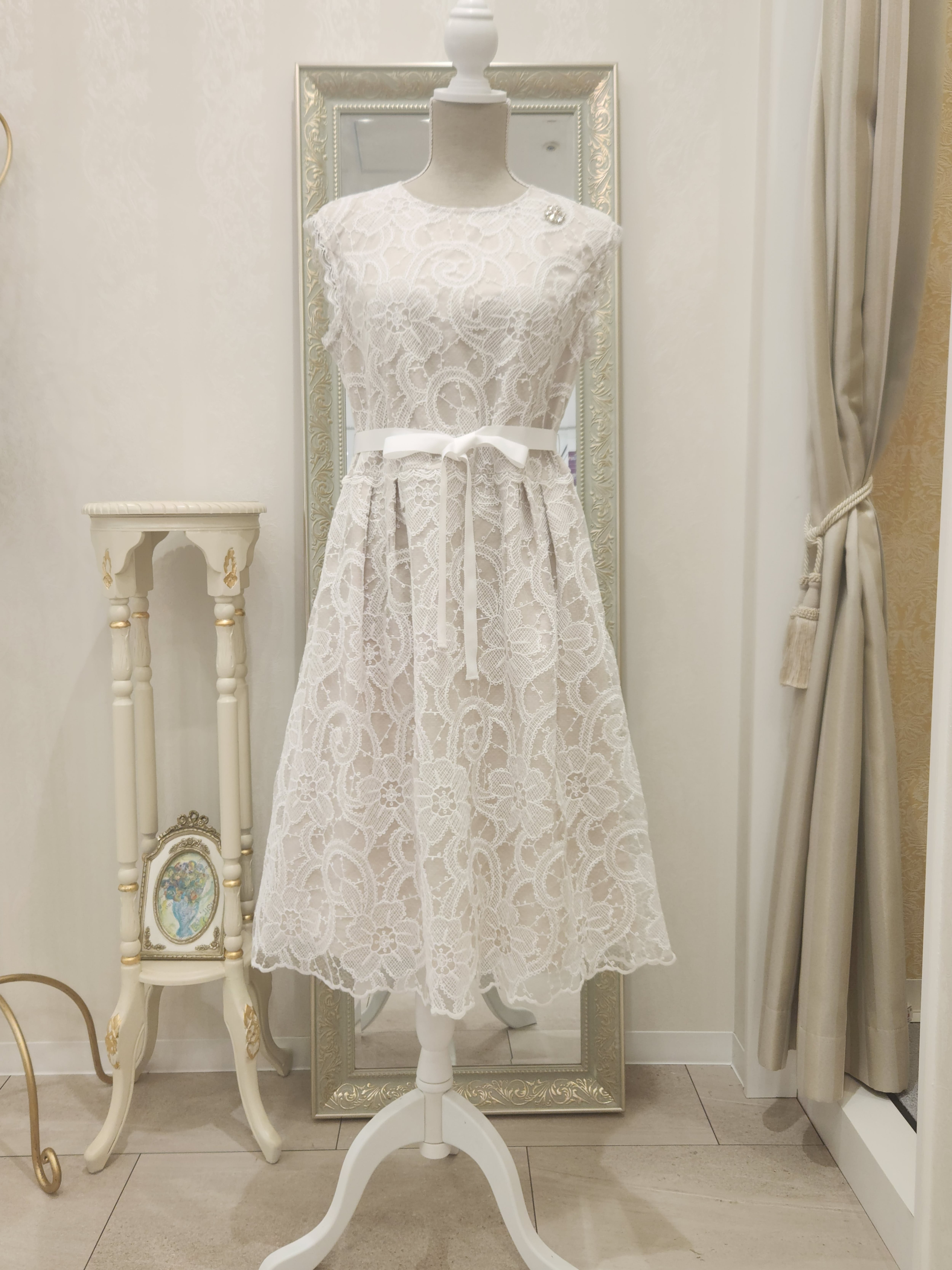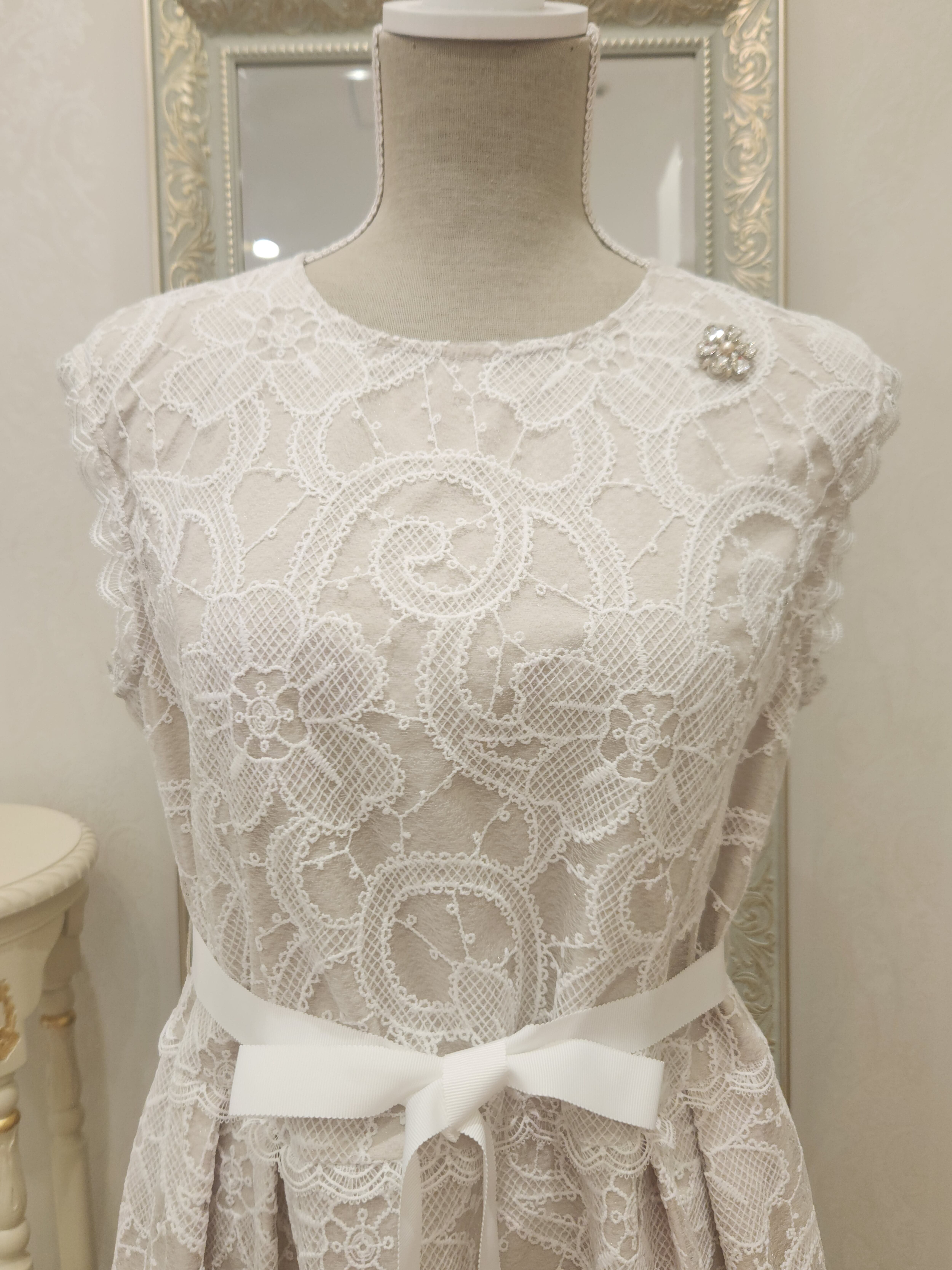 このワンピースは、胸元のブローチ風ビジュー装飾とウエストリボンが洗練された「大人可愛い」を演出する、特別な一着です。特に大きなお花模様の豪華なレースは、エレガントな印象ながらも女性らしい柔らかさを感じさせてくれます。