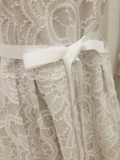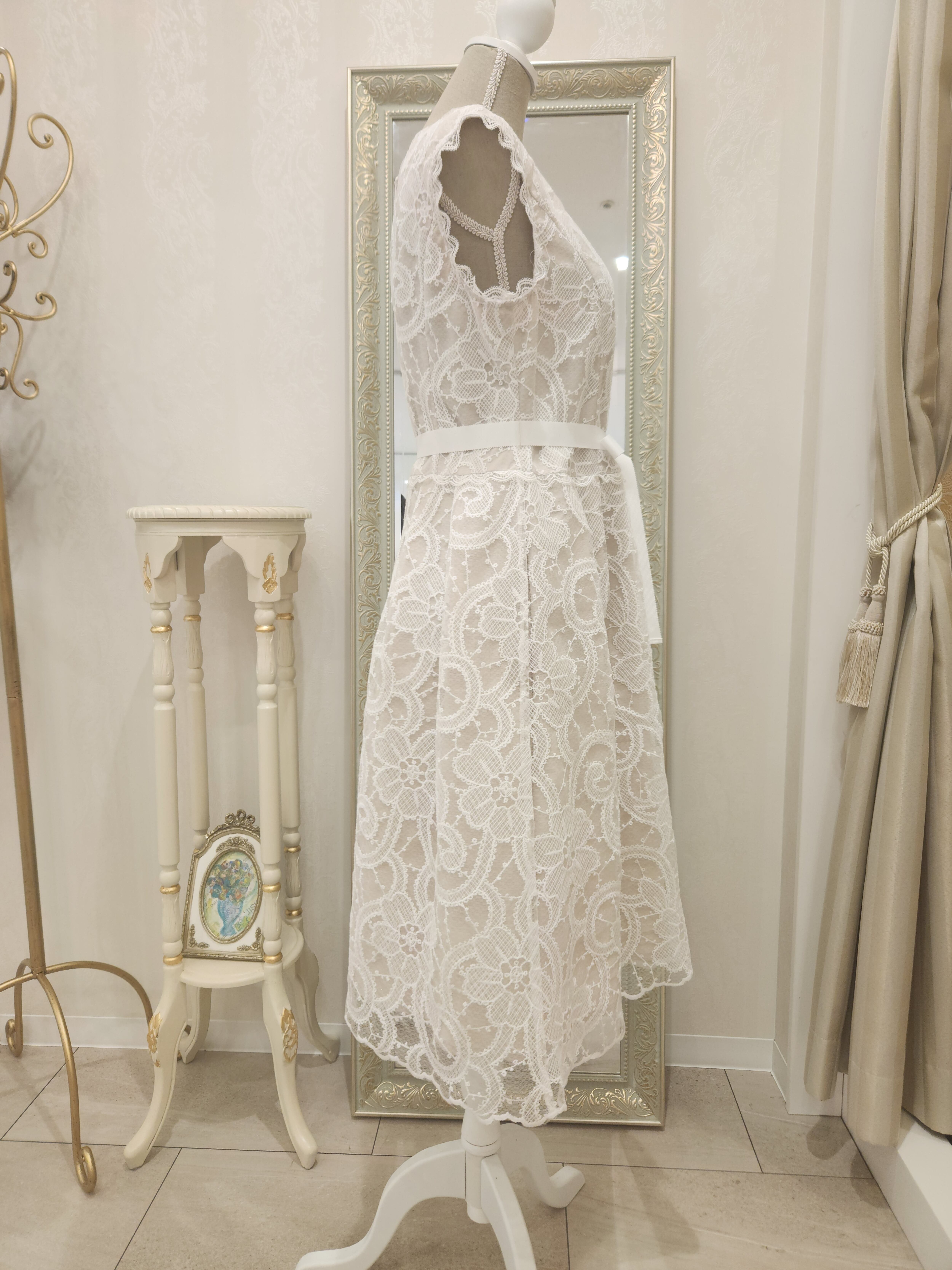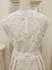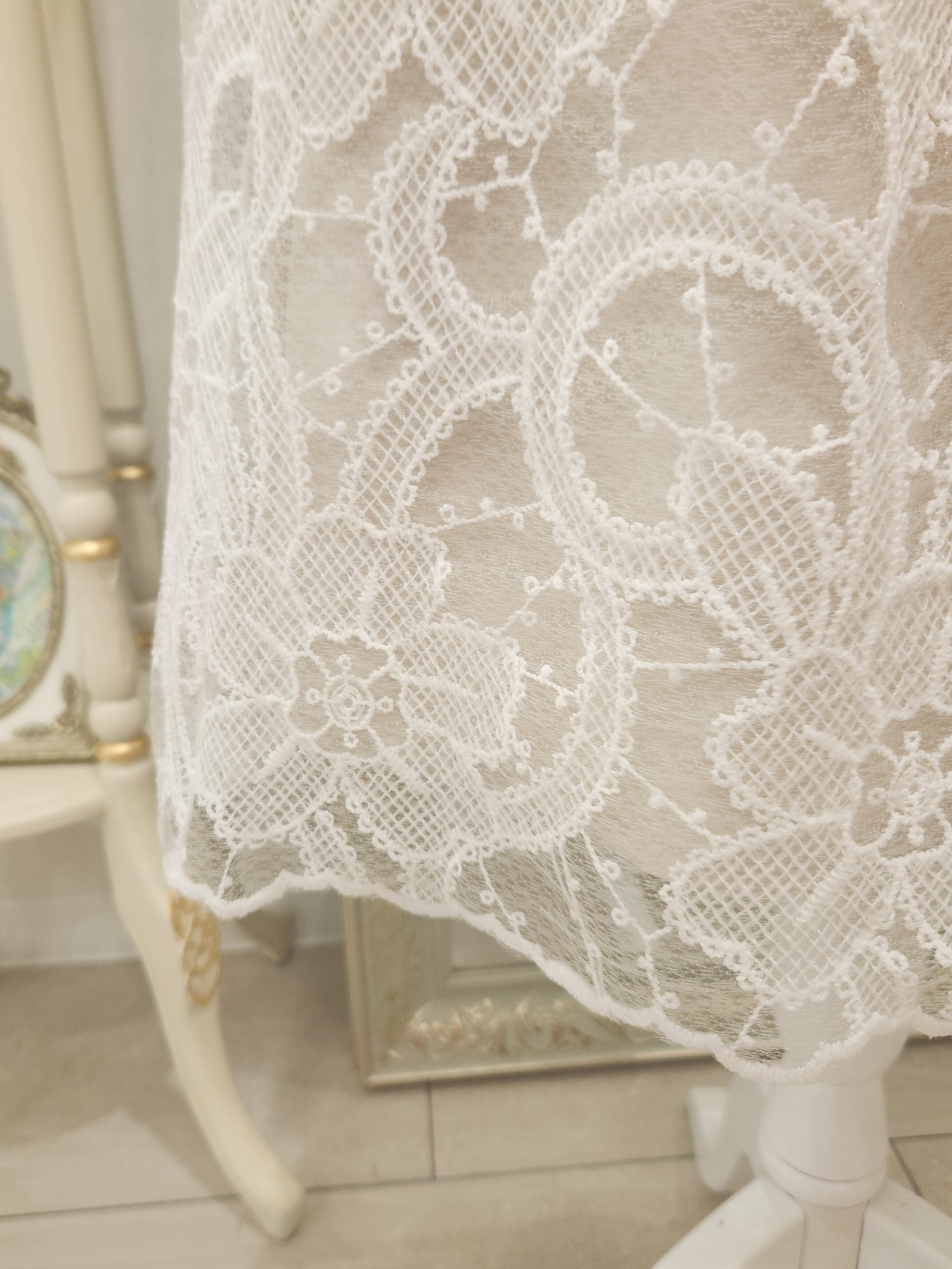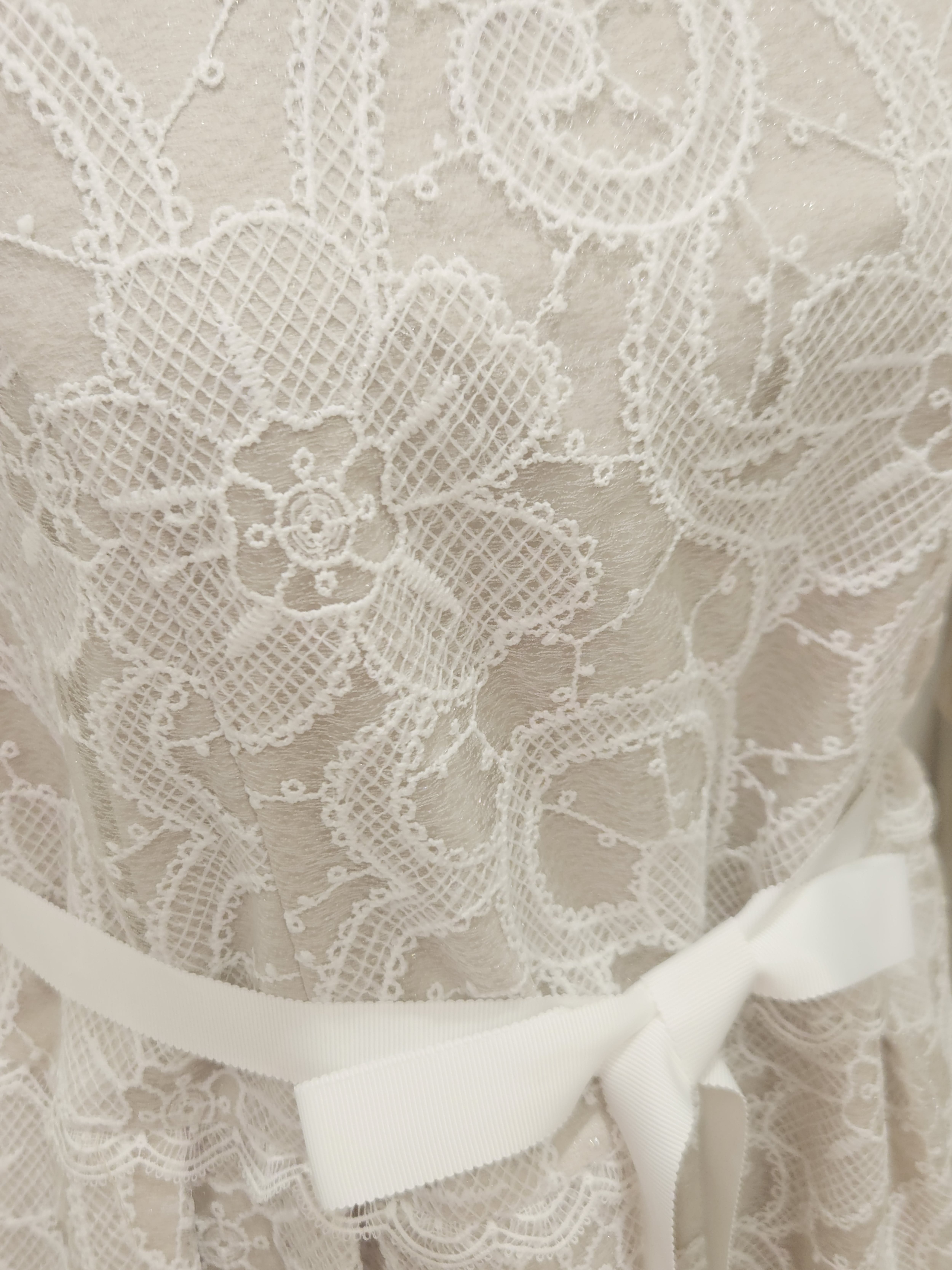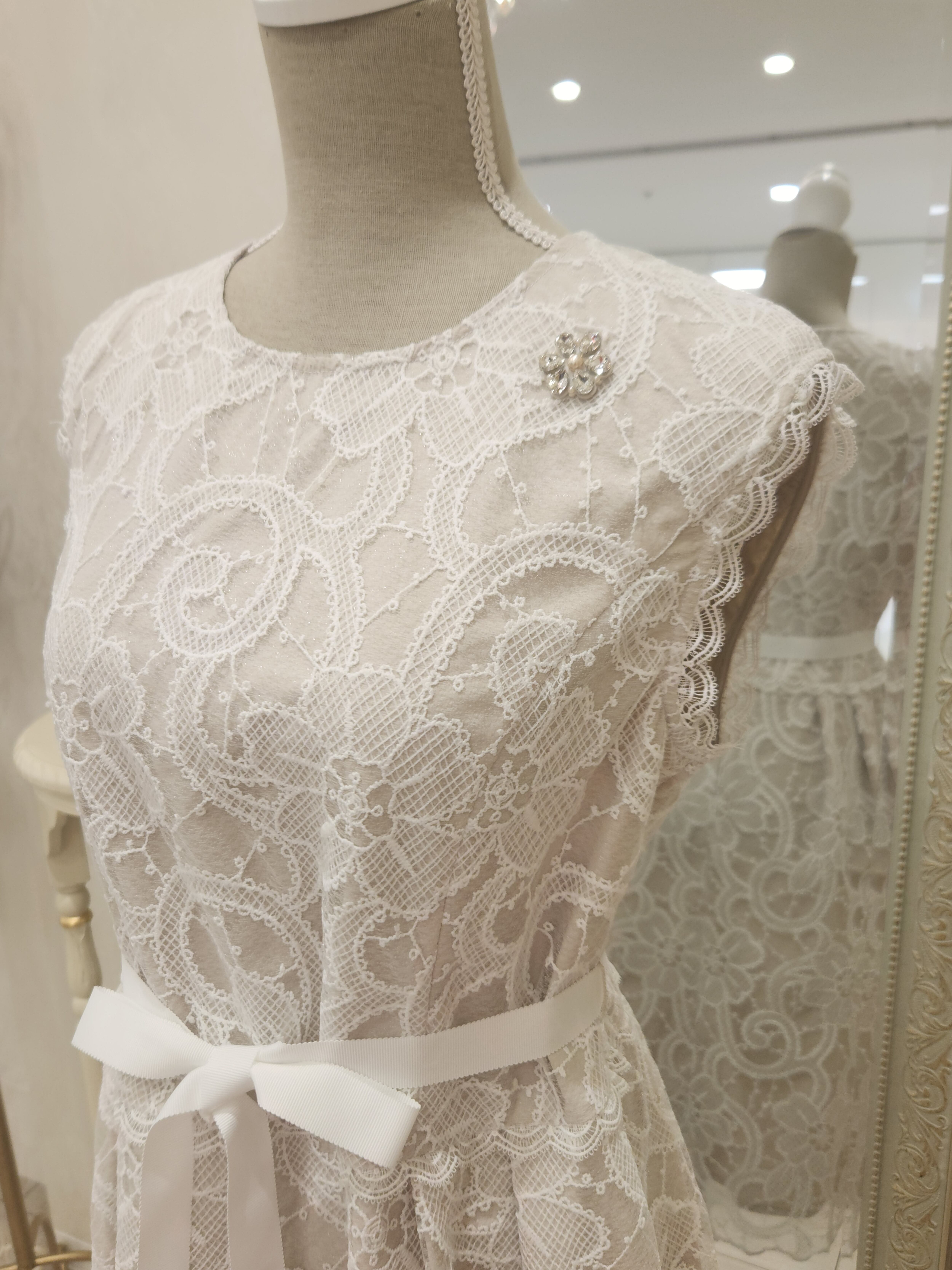 このワンピースは、胸元のブローチ風ビジュー装飾とウエストリボンが洗練された「大人可愛い」を演出する、特別な一着です。特に大きなお花模様の豪華なレースは、エレガントな印象ながらも女性らしい柔らかさを感じさせてくれます。